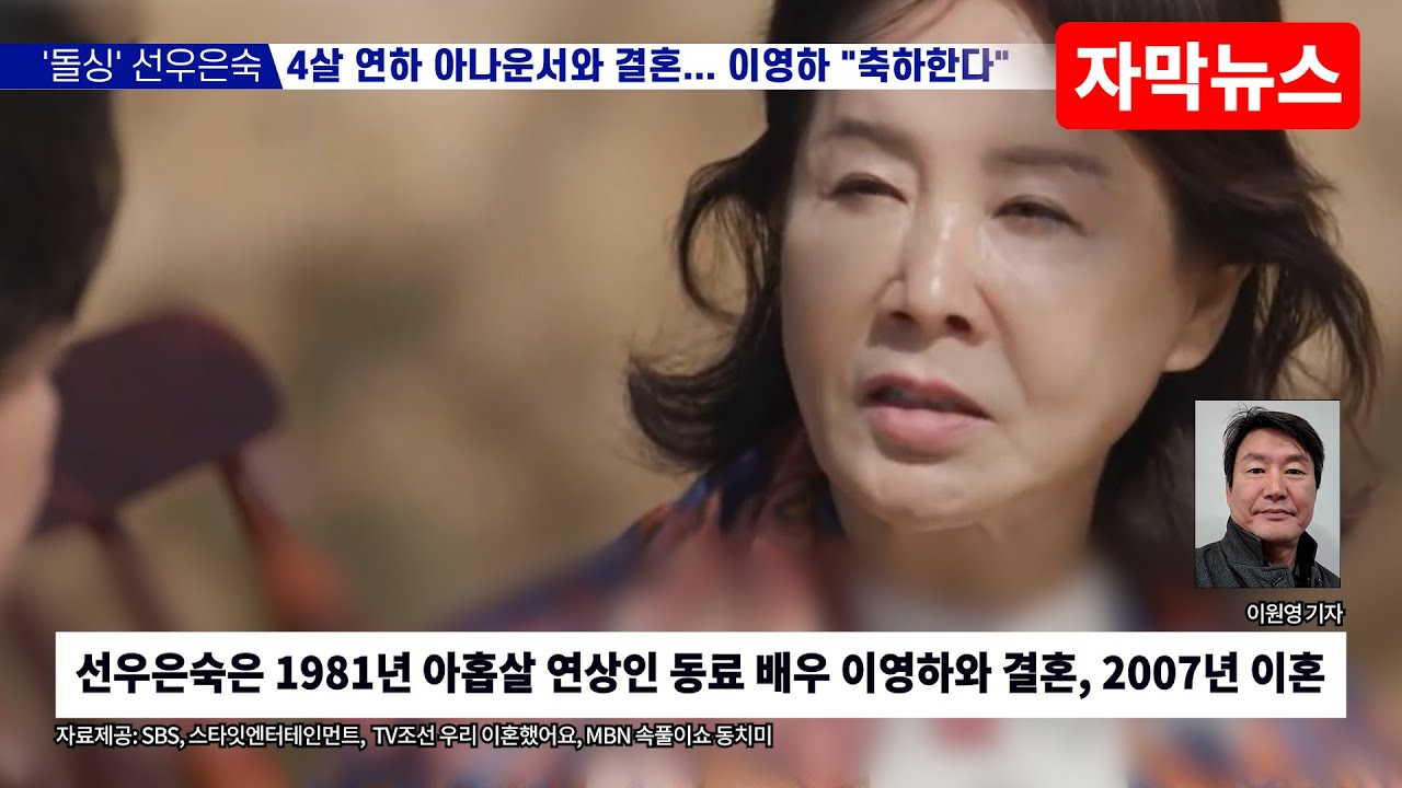 서울연합뉴스 강애란 기자 배우 선우은숙 63이 4살 연하 아나운서 유영재 59와 재혼했다. 지난 23일 방송된 MBN 예능프로그램 속풀이쇼 동치미에서 이혼후 13년 만에 재회한 배우 이영하와 선우은숙의 모습이 그려졌다. 선우은숙이영하 15년만 재회 이혼 6개월 후 사업가 재혼 루머 상처 우이혼종합 스포츠조선닷컴 이우주 기자 우리 이혼했어요 이영하 선우은숙이 15년 만에 처음으로 단둘이.